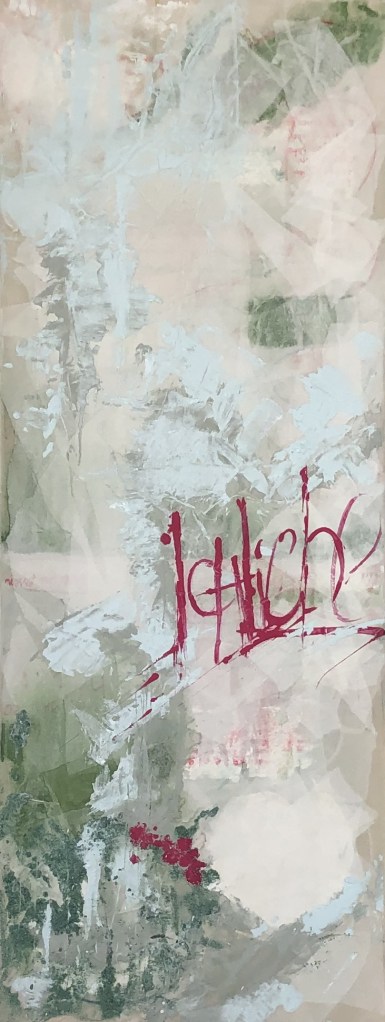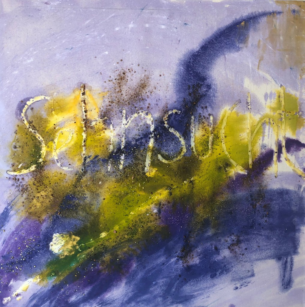 In diesem Bild vereinen sich Farbe, Duft und Form. Bienenwachs, Myrrhe, Weihrauch – die Materialien sprechen für sich. Das Wort „Sehnsucht“ mit Bienenwachs geschrieben steht für das leuchtende Wort in dieser Zeit.