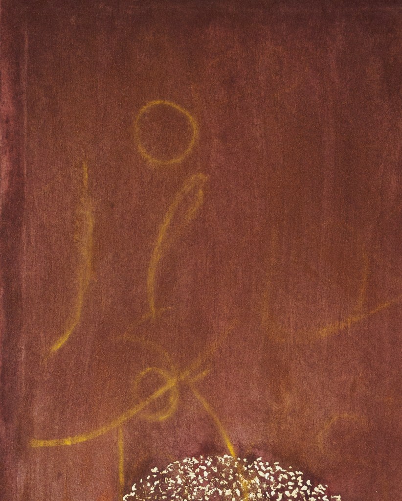 Der Zauber des Lebens spiegelt sich in diesem Bild wider. Die Grundierung habe ich mit Hämatit gearbeitet. Die sinnliche Wahrnehmung entstand über meine Hände, mit denen ich das Material auf das Bild aufgetragen habe. Hämatit ist das „Mut-mach-Eisen“ unserer Zeit. Anschließend habe ich Zinn mit feinen Glaskügelchen vermischt und grob mit einem Spachtel auf das Hämatit gestrichen. Zinn steht hier für die Macht im Menschen. Sandelholz und Purpur habe ich in flüssigem Zustand auf das Bild fließen lassen. Sie haben sich ihren eigenen Weg gesucht. Sandelholz schenkt uns innere Wärme. Genauso habe ich das Zentrum mit Gold, den „Zauber des Lebens“ gearbeitet.